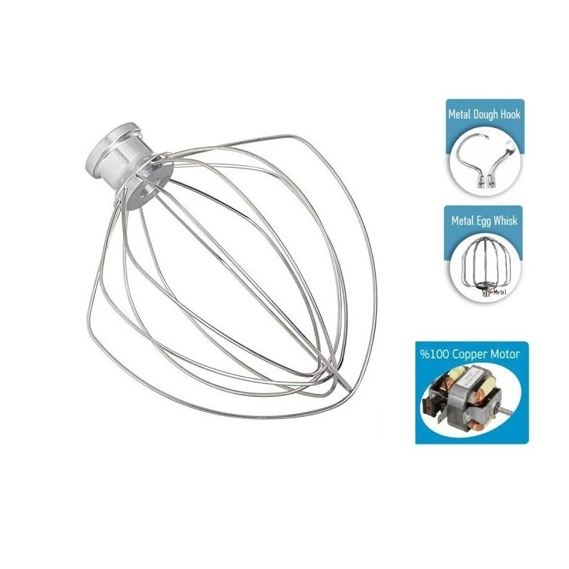 اقلام همراه : ۳ پره همزن مختلف: سری خمیر زن, سری ورز دهنده, سری همزن, کاسه, درب محافظ, دفترچه راهنما