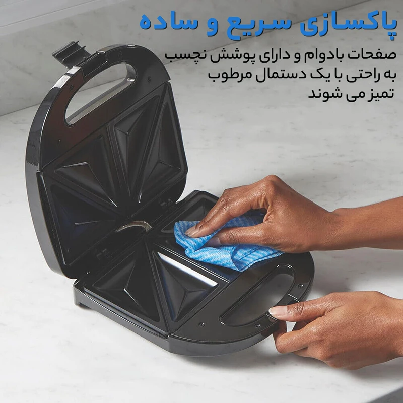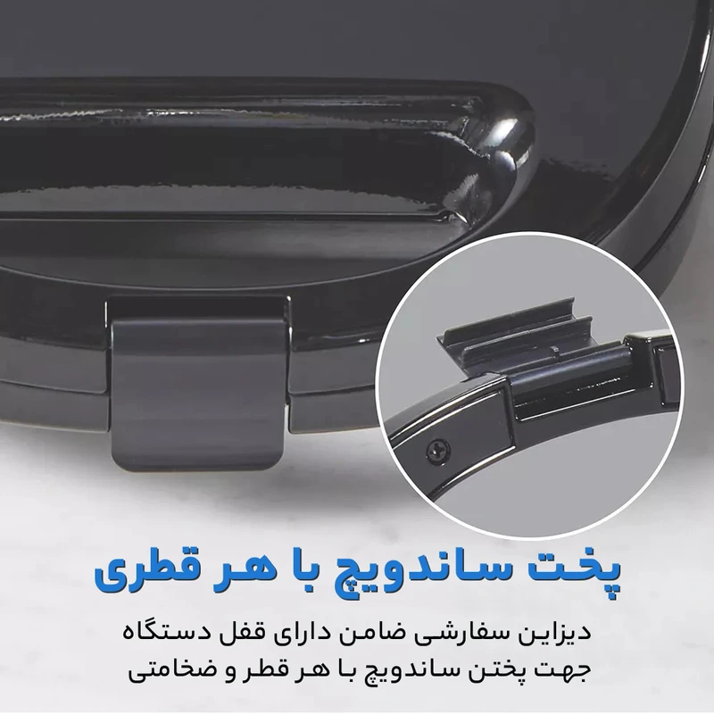 دارای ۶ عدد صفحه شامل : دو عدد صفحه ساندویچ ساز ، دو عدد صفحه گریل و دو عدد صفحه وافل ساز
