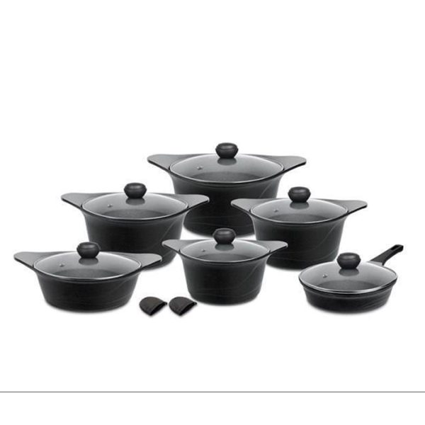 شامل : قابلمه سایز ۱۶، قابلمه سایز ۲۰، قابلمه سایز ۲۴، قابلمه سایز ۲۸، قابلمه سایز ۳۲ ، یک عدد تابه دو دسته سایز ۲۸ ،یک عدد تابه تک دسته درب دار سایز ۲۴، دو عدد دستگیره