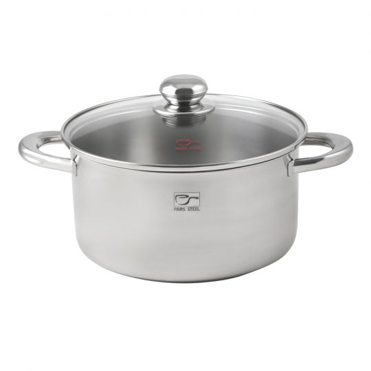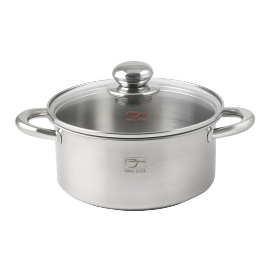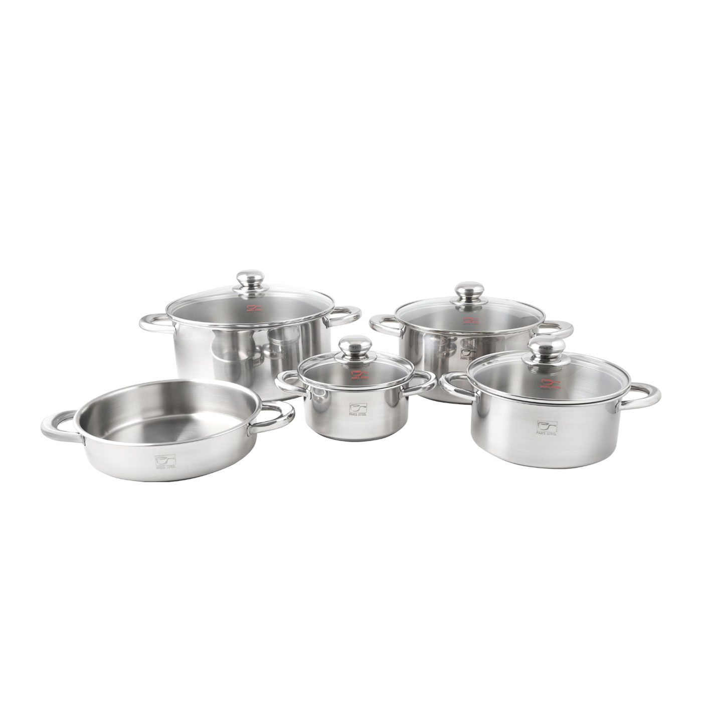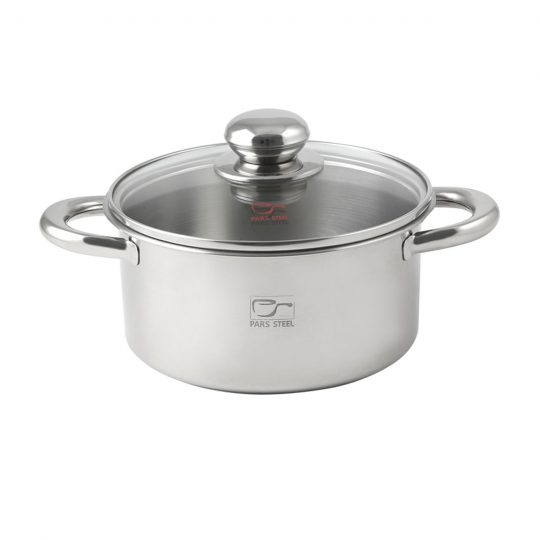 شامل ۹ پارچه : چهار قابلمه در سایزهای مختلف همراه با درب و یک ماهیتابه با سایز ۲۴ (درب مشترک با قابلمه)